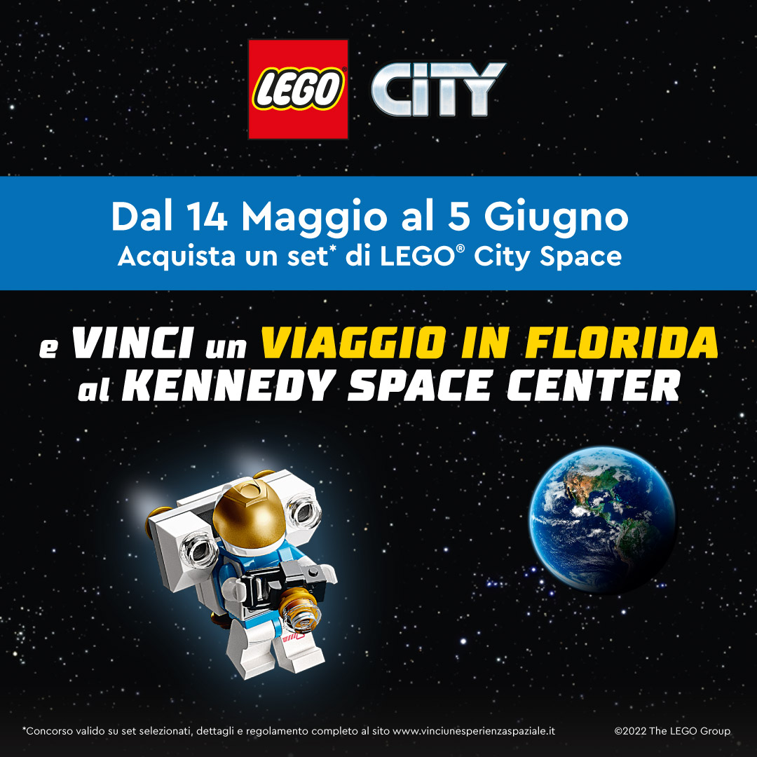 Per rendere l'attività ancora più emozionante, dal 14 maggio fino al 5 giugno, sarà possibile partecipare al concorso "Vinci un'esperienza spaziale con LEGO® City!": in palio un incredibile viaggio per 4 persone in Florida per scoprire il Kennedy Space Center (fruibile tra il 17/10/22 ed il 20/11/22)! Il primo passo per provare ad aggiudicarsi questa meravigliosa esperienza, è l'acquisto di uno dei quattro set LEGO® City Space presso uno store fisico oppure online. Basterà poi connettersi a https://vinciunesperienzaspaziale.it, registrarsi e seguire le istruzioni. Il regolamento completo è disponibile sul medesimo sito.